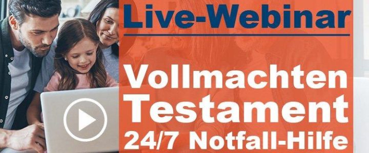 In unserem Live-Webinar klären wir über die größten Irrtümer zum Thema Vollmachten, Testament und 24 Std. Notfall-Hilfe auf. Zudem erfahren Sie, wie Sie sich und Ihre Familie durch dauerhafte persönliche Begleitung nachhaltig absichern können. Ihre persönlichen Fragen dürfen Sie nach dem Webinar direkt an den Experten stellen.